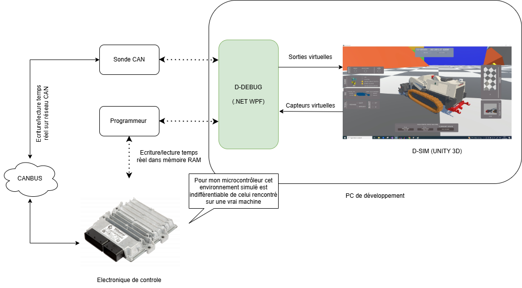Pour cela j'ai développé une application WPF qui communique en temps réel avec le microcontrôleur au travers du programmeur LauterBach, aux éléments réseau par l'interface ethernet/Wifi, au réseau CAN avec une sonde Peak PCAN. Cette application seule suffit à couvrir la majorité des besoins. Elle peut être utilisée en conjonction avec un autre logiciel via une passerelle TCP/IP dédiée, en conséquence nous pouvons transmettre/recevoir des données à un autre logiciel type python, ou Matlab Simulink. Dans notre cas j'ai développé une autre application sous Unity 3D ou je simule des machines de chantier et déminage. Ce logiciel Unity est le seul dont je puisse vous partager une capture car je l'ai fait à titre privé, ..Ci-dessous un descriptions des features de ces logiciels